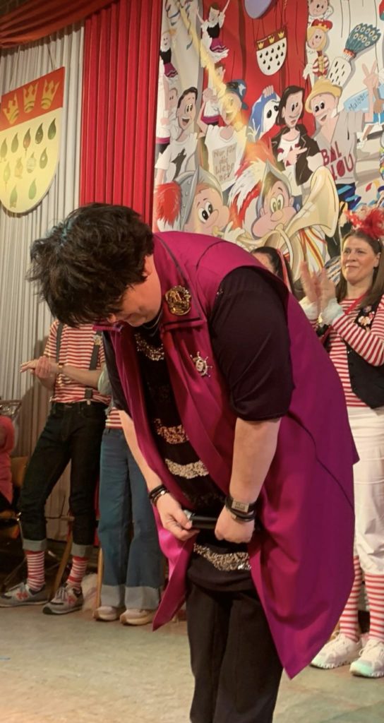 Die Gesellschaft, wo ich viele tolle Auftritte hatte, wo ich damals schon beim Rosenmontagszug auf den Wagen mitfahren durfte, wo ich viele der Mitglieder persönlich kenne, aber nicht zuletzt die Gesellschaft, wo mein Agenturchef, Michael Gerhold, Präsident und Sitzungsleiter ist.