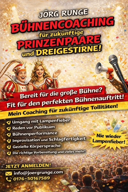 Ich hab schon mit dem Bonner Kinderprinzenpaar gearbeitet, mit einem Prinzenpaar aus Lahnstein bei Koblenz, mit dem Dreigestirn aus Rösrath, dem Dreigestirn aus Overath, einem Dreigestirn aus Hennef. Also das ist kunterbunt, und das ich möchte wirklich nur empfehlen, weil es den Tollitäten eine unfassbare Sicherheit gibt auf der Bühne und es dazu führt, dass sie das, was sie da tun dürfen, eine Session auch wirklich genießen können.