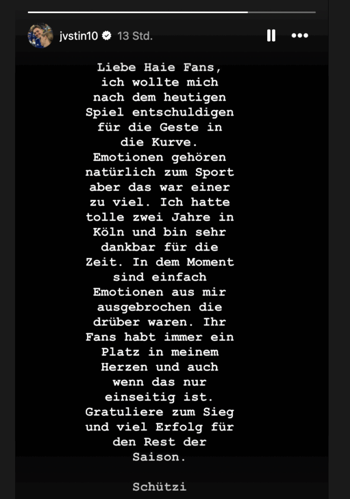 Der Nationalspieler weiter: „Ich hatte tolle zwei Jahre in Köln und bin sehr dankbar für die Zeit. In dem Moment sind einfach aus mir Emotionen rausgebrochen, die drüber waren. Ihr Fans habt immer einen Platz in meinem Herzen und auch wenn das nur einseitig ist. Gratuliere zum Sieg und viel Glück für den Rest der Saison. Schützi.“