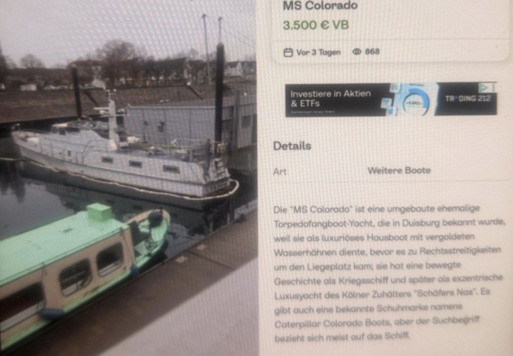 Milieu-Insider Roland Bebak, der die Nas persönlich noch erlebt und gut gekannt hatte, schildert: „Ein Bekannter hat mir auf Facebook eine Kauf-Annonce für das Boot, das inzwischen in Chorweiler liegen soll, weitergeleitet. Ich wollte nicht lange überlegen und zuschlagen, doch ich sah, dass die MS Colorado für einen geringen vierstelligen Betrag reserviert war, wie zu lesen war. Kurz darauf war die Annonce nicht mehr aufzufinden!“