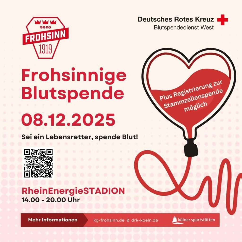 Die Große KG Frohsinn Köln 1919 e.V. ruft zur lebensrettenden Blutspende auf! Unter dem kölschen Motto „Gemeinsam jeck sein heißt auch: füreinander da sein!“ findet am Montag, den 08. Dezember 2025, von 14:00 bis 20:00 Uhr eine Blutspendeaktion im RheinEnergie STADION statt.