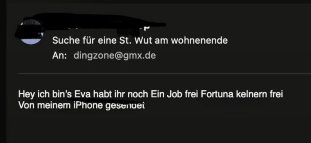 „Suche für eine St. Wut am wohnende“ heißt es im Betreff bereits ziemlich rätselhaft. Doch dann kommt erst der offenbar per Iphone abgeschickte Inhalt: „Hey ich bin’s Eva habt ihr noch Ein Job frei Fortuna Kellnern frei“.