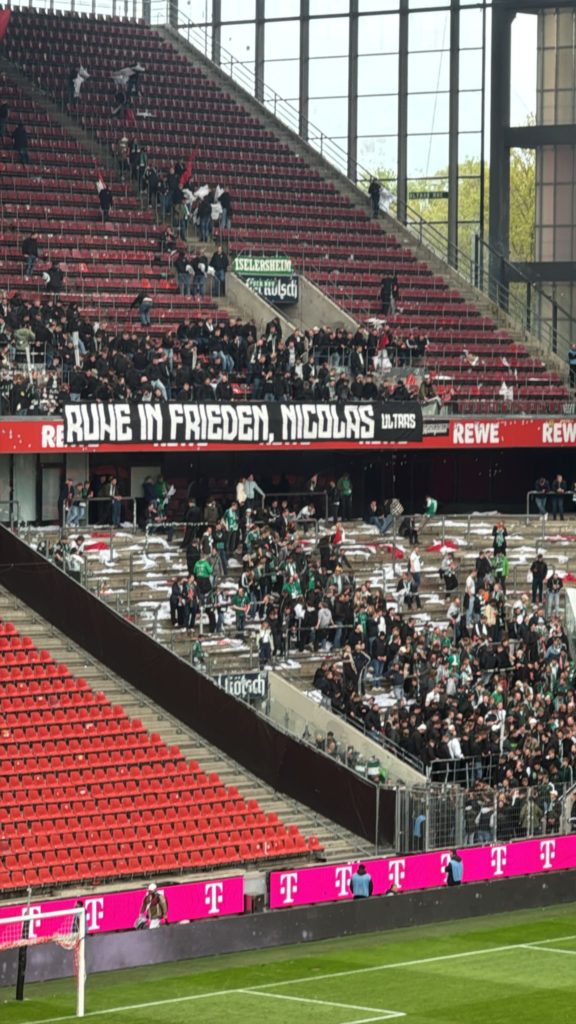 Auch dort wurde ein schwarzes Gedenkbanner für Nicolas gezeigt, flankiert von rot-weißen Fahnen und Pyroshow: „Ruhe in Frieden Nicolas“ wurde im eigentlich grün-weißen Block aus Respekt gezeigt.