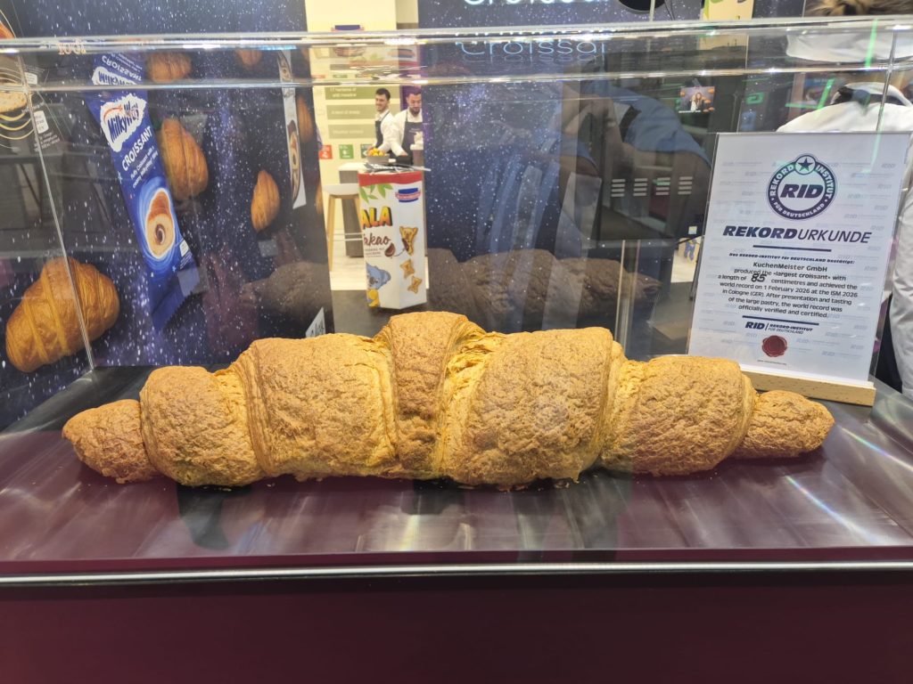 Darauf im Glaskasten auf einer eigenen Urkunde feierlich zu lesen: „Kuchenmeister produzierte das größte Croissant mit einer Länge von 85 Zentimetern und erreichte den Weltrekord am 1.2.2026 auf der ISM 2026 in Köln. Nach der Präsentation und dem Verkosten der großen Leckerei wurde der Weltrekord offiziell verifiziert und beurkundet.“