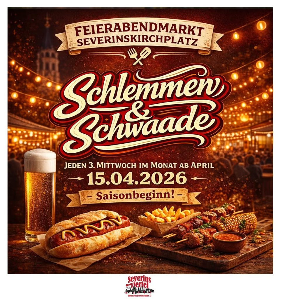 „Schlemmen & Schwaade – Der Feierabendmarkt auf dem Severinskirchplatz Jeden 3. Mittwoch im Monat ab April 15.04.2026 – Saisonbeginn! – Kölsch, Streetfood & more. Powered by Severinsviertel Köln“, wird es beworben.