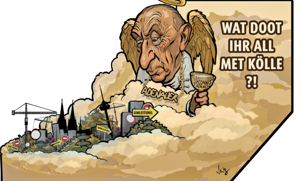 „Mer dun et all für Kölle“ Das ist das Motto dieser Session. Wir besingen unser Köln in Hunderten von kölschen Liedern. Immer und immer wieder beschwören wir unsere ewige Liebe zu dieser Stadt. Aber das Thema Nr. 1 im Kommunalwahlkampf war die Verwahrlosung der Stadt. Da passt doch was nicht ganz zusammen! Und Konrad Adenauer würde uns angesichts dieser Zustände an seinem 150. Geburtstag ganz sicher gehörig die Leviten lesen. Er würde uns das Motto als Gegenfrage vor den Latz knallen: Wat doot ihr all met Kölle?! Und deswegen fahren wir Adenauer auch nicht als Denkmal durch die Stadt, sondern als „Denk mal drüber nach”!