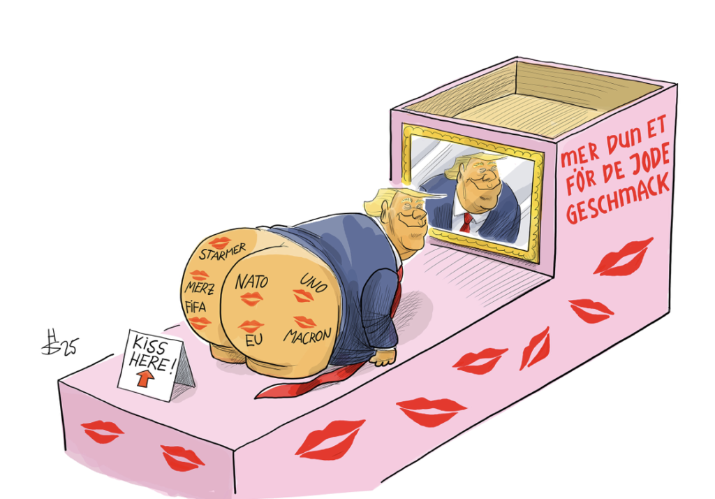 Dieses Motiv ist dem „König von Amerika“ gewidmet und seiner sehr besonderen Art, Hof zu halten. Während sich früher europäische Würdenträger mit einem Kuss des Rings oder der Füße die Ehre erwiesen ließen, heißt es bei Trump: „Man möge ihn am Arsche küssen!“ Und wo Selenskyj noch denkwürdig antwortete: „Du mich auch!“ kommen FIFA, NATO, EU und viele mehr willfährig angekrochen. Warum, ist schwer zu sagen. Vielleicht schmeckt das präsidiale Gesäß sogar?