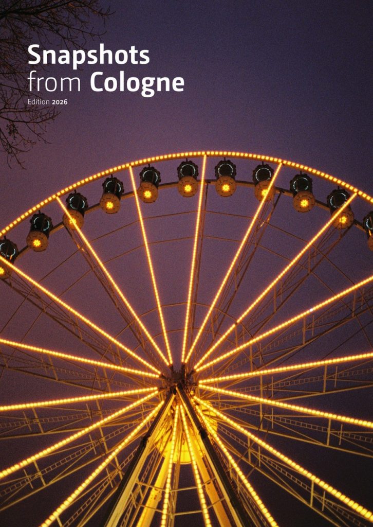 „Snapshots from Cologne“ zeigt Köln abseits üblicher Dom- oder Rheinmotive. Der Kalender setzt auf ungewöhnliche Perspektiven, urbane Details und eine rohe, analoge Bildästhetik, die neue Blickwinkel auf die Stadt eröffnet. Der Pop-Up Store bietet Raum für Austausch, Kaltegetränke wie Kölsch, Wiess oder Fassbrause, Gespräche und einen kreativen Jahresausklang mit den beiden Projektinitiatoren.