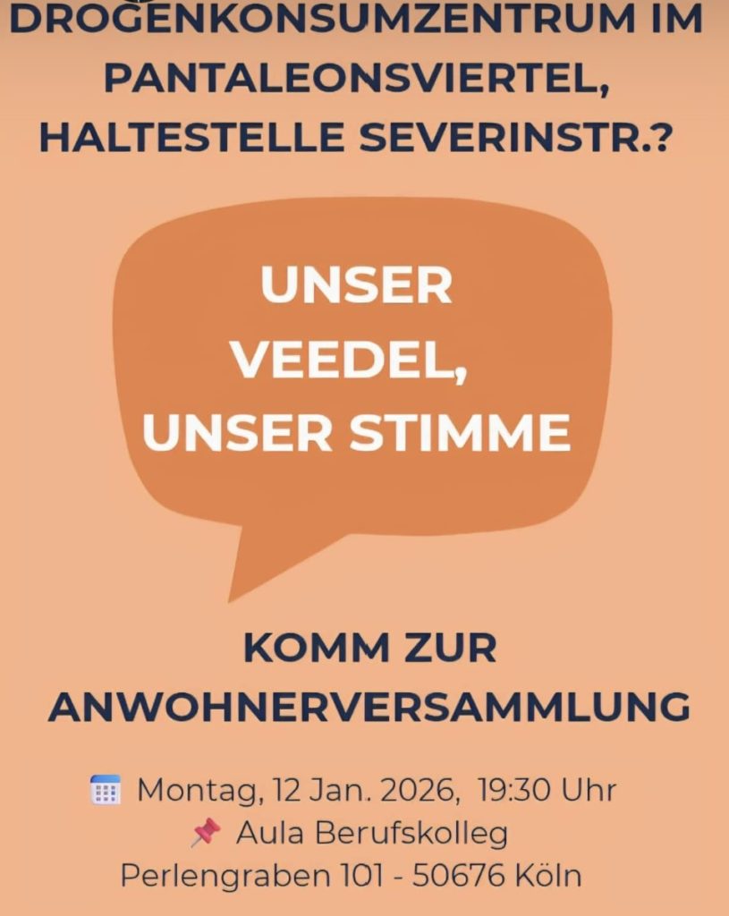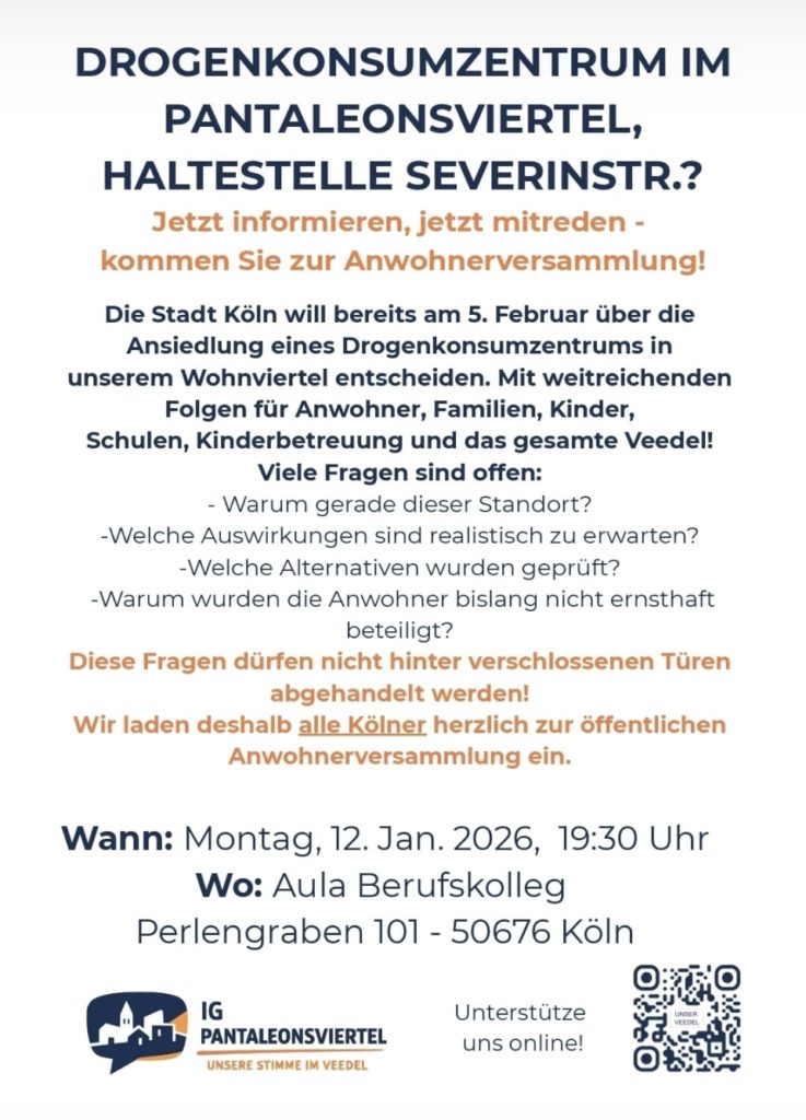 Denn: Die „IG Pantaleonsviertel“ hat da was gegen. Mit Flugblättern unter dem Slogan „Unser Veedel, unsere Stimme“ wird gegen den Plan des Drogenkonsumzentrums im Wohngebiet protestiert und zu einer Versammlung animiert. Diese soll in der Aula Berufskolleg am Perlengraben, direkt an der avisierten Stelle also, am 12. Januar um 19:30 Uhr steigen. Per QR-Code kann man auch online die Initiative unterstützen.