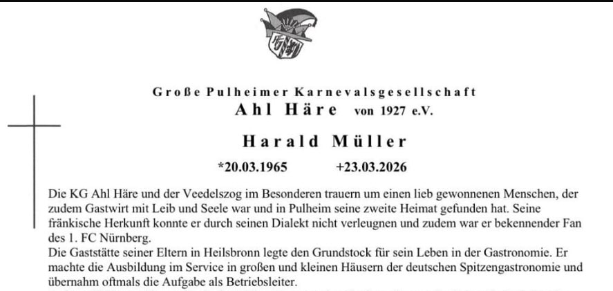 Und der in diesem Jubiläumsjahr wieder Prinz Karneval gewesen wäre: „Wir trauern um einen lieb gewonnenen Menschen, der zudem Gastwirt mit Leib und Seele war und in Pulheim seine zweite Heimat gefunden hat. Seine fränkische Herkunft konnte er durch seinen Dialekt nicht verleugnen und zudem war er bekennender Fan des 1. FC Nürnberg.