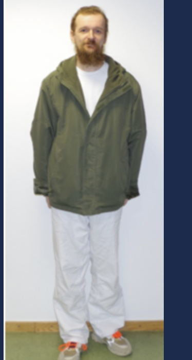 ist bekleidet mit einer grünen Jacke. Er ist gehörlos und kann sich lediglich mittels ukrainischer Gebärdensprache verständigen.