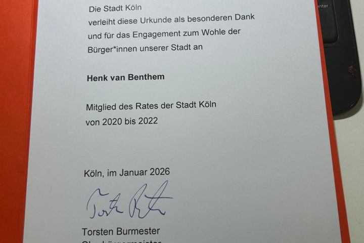 Köln | Stell dir vor, erst wirst du „vergessen“ und dann kriegst du kalte Post in den Briefkasten. Ohne eine persönliche Note. Ohne Stil. Null. Der frühere Porzer Bezirksbürgermeister Henk van Benthem (CDU) war enttäuscht, als er den unerwarteten Umschlag vor wenigen Tagen mit der kargen Urkunde öffnete. Nachdem das langjährige Mitglied des Rates der Stadt Köln bei der offiziellen Verabschiedung der ausgeschiedenen Mitglieder Ende Januar weder informiert noch berücksichtigt worden war, hatte er verärgert interveniert. Wurde er aus Schlamperei der Verwaltung vergessen – oder war es einfach ein denkbar unglückliches Versehen? Die Anfrage von koeln0221 zu den Gründen der … Stadt Köln verschickt „kalte Urkunde“ per Post weiterlesen