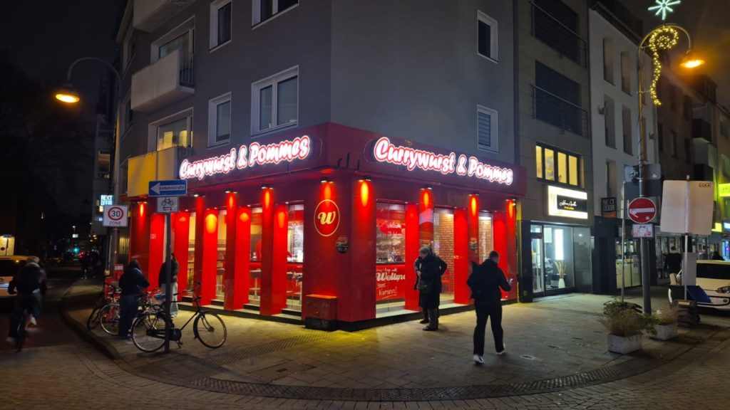 Pommes, Bratwurst und Currywurst gibt es laut Aushang montags und dienstags inklusive Ketchup und Mayo für 2 € – das nennt man in der Tat aus Kundensicht wohl „Weltmeister“-lich. Denn durch die Preisexplosionen in der Gastro sind die Zahlen mit denen von 2006 in der Tat kaum zu vergleichen.