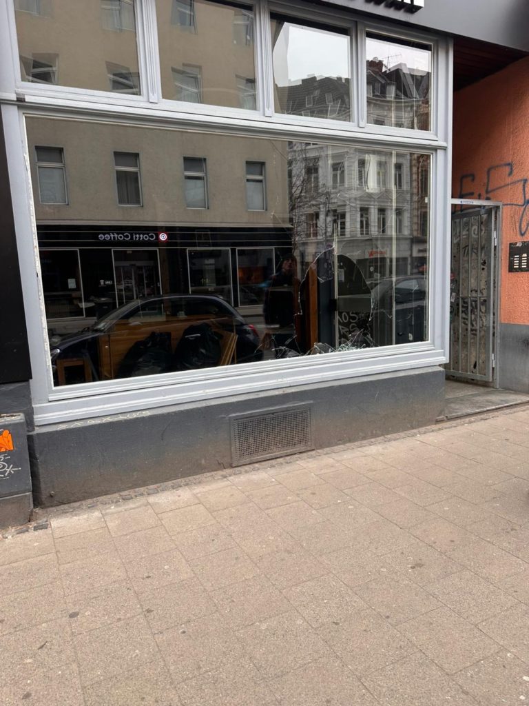 Die gerade erst erneuerte Fensterfront von Bebaks Box-Geschäft, die bereits vor Wochen zerstört worden war, hielt nur einen Tag – dann war die Scheibe auf der Bonner Straße eingeworfen.