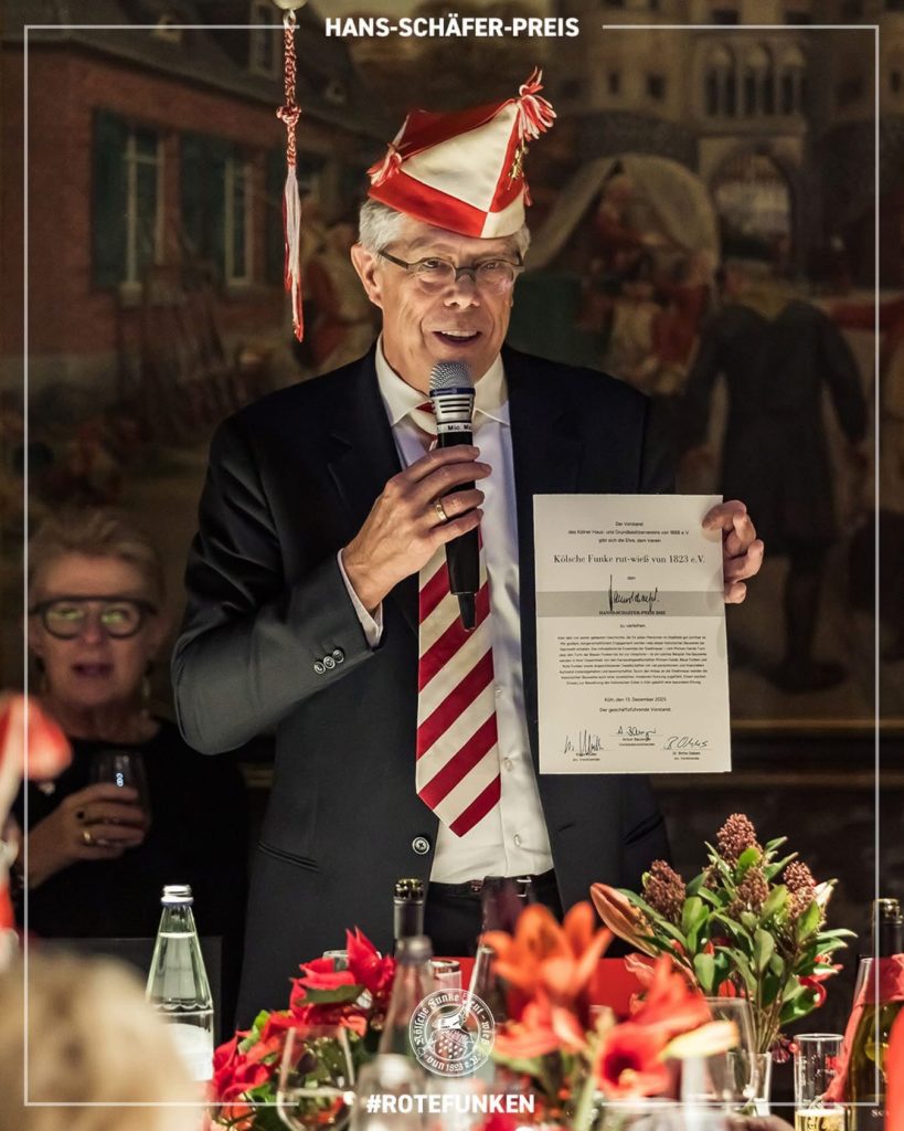 „Mit außerordentlicher Freude, großem Stolz und tiefer Dankbarkeit nehmen die ROTEN FUNKEN die Verleihung des Hans-Schäfer-Preises 2025 durch den Haus- und Grundbesitzerverein Köln entgegen“, gaben sie bekannt.