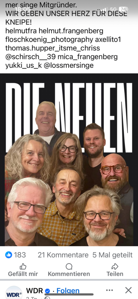 Helmut Frangenberg, Loss mer singe Mitgründer, Florian Schmitz, Loss mer singe Mitstreiter, Axel Hirschberg, Gastgeber aus Überzeugung, Thomas Hüpper, Loss mer singe Mitglied, Christian Jungblut, Loss mer singe Mitglied, Sophie Hirschberg, Gastgeberin aus Überzeugung, Mica Frangenberg, Loss mer singe Mitgründerin, Yukki Fahlbusch, Loss mer singe Mitgründer“, heißt es in den sozialen Netzwerken, „WIR GEBEN UNSER HERZ FÜR DIESE KNEIPE!“